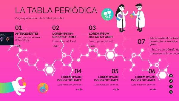 “Robert Boyle: El padre de la química moderna.” (2022, November 16). Eupmt Portal para estudiantes. https://eupmt.es/robert-boyle-padre-de-la-quimica-moderna/ 3-E. (2023, May 12). ¿Qué son las tríadas de Döbereiner? TRIPLENLACE. https://triplenlace.com/2023/05/12/que-son-las-triadas-de-dobereiner/ Cano, J. P. (n.d.). Elementos Qu�micos: Historia. Madrid.org. Retrieved June 17, 2023, from http://herramientas.educa.madrid.org/tabla/evolucion/historiasp5.html Elementos predichos por Mendeleev. (n.d.). Academia-lab.com. Retrieved June 17, 2023, from https://academia-lab.com/enciclopedia/elementos-predichos-por-mendeleev/ Francisco Partal Ureña / *The Conversation. (2020, December 20). Polonio y radio: dos elementos radiactivos, mortales y muy útiles. National geographic. https://www.nationalgeographic.com.es/ciencia/polonio-y-radio-dos-elementos-radiactivos-mortales-y-muy-utiles_16174 Glenn Seaborg. (n.d.). Biografiasyvidas.com. Retrieved June 17, 2023, from https://www.biografiasyvidas.com/biografia/s/seaborg.htm Gómez-Esteban, P. (n.d.). Robert Boyle (II) - El Tamiz. Eltamiz.com. Retrieved June 17, 2023, from https://eltamiz.com/2013/02/28/robert-boyle-ii/ Henry Moseley, justificó cuantitativamente el concepto de número atómico. (2020, November 23). Rincón educativo. https://rinconeducativo.org/es/recursos-educativos/henry-moseley-justifico-cuantitativamente-el-concepto-de-numero-atomico/ Historia de la Química timeline. (n.d.). Timetoast Timelines. Retrieved June 17, 2023, from https://www.timetoast.com/timelines/historia-de-la-quimica-1aa8bab8-23bf-4592-894a-59ce7ee3fb22 La ley de Moseley. (2018, December 30). Clickmica. https://clickmica.fundaciondescubre.es/conoce/descubrimientos/la-ley-moseley/ Las 7 curiosidades de la tabla periódica que más te sorprenderán - ZS España. (2019, December 11). ZS España; Zschimmer & Schwarz España. https://www.zschimmer-schwarz.es/noticias/las-7-curiosidades-de-la-tabla-periodica-que-mas-te-sorprenderan/ Los cuatro nuevos elementos de la tabla periódica ya tienen nombre. (n.d.). Www.uv.es. Retrieved June 17, 2023, from https://www.uv.es/uvweb/master-quimica/es/blog/cuatro-nuevos-elementos-tabla-periodica-ya-tienen-nombre-1285949128883/GasetaRecerca.html?id=1285971958697 Materia, T. (2021, January 19). Historia de la tabla periódica. Toda Materia. https://www.todamateria.com/historia-de-la-tabla-periodica/ Nihonio, moscovio, teneso y oganesón, confirmados como nuevos elementos de la tabla periódica. (n.d.). Agencia SINC. Retrieved June 17, 2023, from https://www.agenciasinc.es/Noticias/Nihonio-moscovio-teneso-y-oganeson-confirmados-como-nuevos-elementos-de-la-tabla-periodica ¿PORQUÉ DEMÓCRITO? (2021, February 20). ATENEO DE CAPACITACIÓN SUPERIOR. https://fundacionquimica.org.ar/ateneo/porque-democrito/ (N.d.). Pixabay.com. Retrieved June 17, 2023, from https://pixabay.com/es/