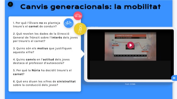 1. Per què l’Àlvaro no es planteja treure’s el carnet de conduir? 2. Què revelen les dades de la Direcció General de Trànsit sobre l’interès dels joves per treure’s el carnet? 3. Quins són els motius que justifiquen aquesta xifra? 4. Quins canvis en l’actitud dels joves destaca el professor d’autoescola? 5. Per què la Núria ha decidit treure’s el carnet? 6. Què ens diuen les xifres de sinistralitat sobre la conducció dels joves?