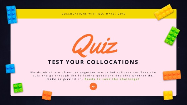 Words which are often use together are called collocations.Take the quiz and go through the following questions deciding whether do, make or give fit in. Ready to take the challenge?