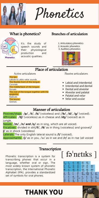 It`s the study of speech sounds and their physiological production and acoustic qualities.