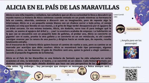 Alicia es una niña inquieta y soñadora, tan soñadora que un día su curiosidad le lleva a descubrir un mundo nuevo.La historia de Alicia comienza cuando sentada en un prado mientras su hermana le leía un cuento, aburrida, comienza a discurrir con su imaginación, pero de repente algo la interrumpe; Alicia ve a un pequeño conejo blanco con un chaleco correr a toda prisa, el conejo señalaba un reloj que llevaba en sus manos, y al grito de llego tarde! desaparecía por el agujero de un árbol cercano. En ese mismo instante, Alicia, sin dudarlo, corre tras él para indagar qué le sucede, se asoma al agujero del árbol y… ¡cae! La aventura acababa de empezar. La habitación en la que cae se encuentra con un pequeño bote de galletas, al probar una, Alicia se convierte en gigante! con el susto, prueba la otra galleta y se convierte en un ser minúsculo, es ahí cuando consigue avanzar por la ranura de una puerta y dirigirse hacia un mndo que, de repente, resulta totalmente extraño.En el trascurso de la historia Alicia quiere buscar el camino de vuelta a casa, pero su camino se ve marcado por acertijos que debe resolver. Alicia se encontrará todo tipo personajes, algunos buenos, y otros, no tan buenos. El gato de Cheshire será uno, quien la guiará a elegir caminos… (accede al pequeño fragmento de la historia). Alicia en el País de las Maravillas es una historia de fantasía que ha sido adaptada en varias ocasiones al cine, la televisión y el teatro, y se convirtió en un clásico. Cada historia contada por distintos autores tiene algún detalle distinto que hace ver una perspectiva de los personajes no vista antes. Sin embargo… hay personajes que siempre se reconocen. La Reina siempre será… Reina!