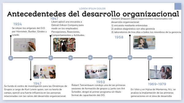 Herbert Shepard realizó experimentos relacionados con desarrollo organizacional: 1) encuesta mediante entrevistas 2) análisis diagnóstico con alta gerencia 3) laboratorios de tres días a todos los miembros de la gerencia.