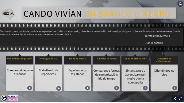 Investigación S.A. - Presentación que da pe á reflexión sobre o inicio e os contidos da investigación. - Reporteiros por un día. Descrición da tarefa de recompilación de imaxes, documentos, testemuñas persoais e obxectos relacionados coas dez preguntas que se suxiren. Danse pautas e modelos para a recollida de información (Testemuñas personais, documentos e fotografías), así como suxestións sobre métodos e soportes para gardala. - Organizando a información do equipo. Debátese, consensúase, clasifícase, priorízase, elíxese e redáctase as respostas ás preguntas nos equipos. - Compartindo a información. Preparación por equipos dunha presentación coa información relevante; seguindo pautas de formato, contido e estética. - Curioseando. Consulta de enlaces para profundizar na sociedade dos cincuenta e sesenta.