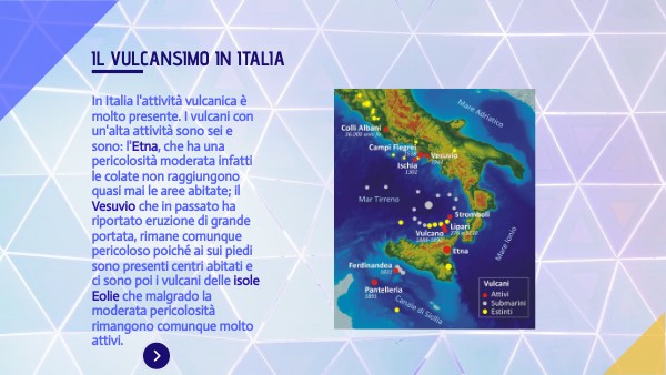 In Italia l'attività vulcanica è molto presente. I vulcani con un'alta attività sono sei e sono: l'Etna, che ha una pericolosità moderata infatti le colate non raggiungono quasi mai le aree abitate; il Vesuvio che in passato ha riportato eruzione di grande portata, rimane comunque pericoloso poiché ai sui piedi sono presenti centri abitati e ci sono poi i vulcani delle isole Eolie che malgrado la moderata pericolosità rimangono comunque molto attivi.