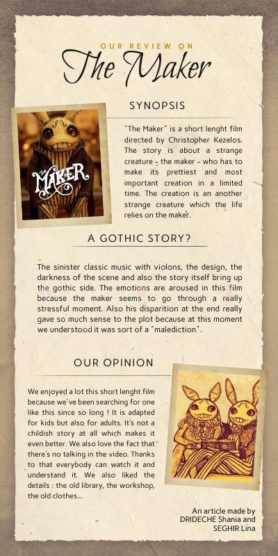 "The Maker" is a short lenght film directed by Christopher Kezelos. The story is about a strange creature - the maker - who has to make its prettiest and most important creation in a limited time. The creation is an another strange creature which the life relies on the maker.