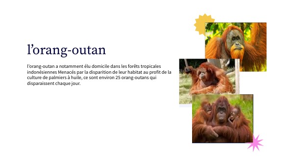 l’orang-outan a notamment élu domicile dans les forêts tropicales indonésiennes Menacés par la disparition de leur habitat au profit de la culture de palmiers à huile, ce sont environ 25 orang-outans qui disparaissent chaque jour.
