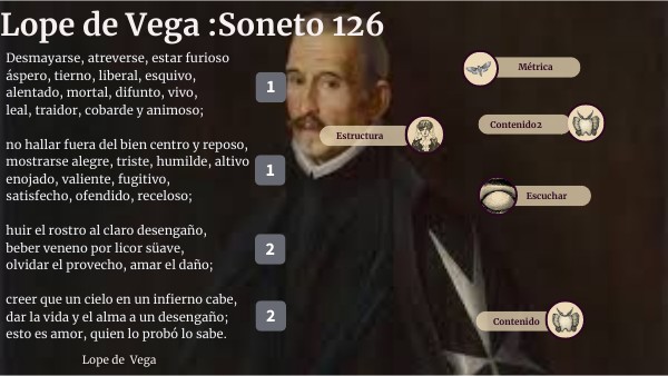 Desmayarse, atreverse, estar furioso áspero, tierno, liberal, esquivo, alentado, mortal, difunto, vivo, leal, traidor, cobarde y animoso; no hallar fuera del bien centro y reposo, mostrarse alegre, triste, humilde, altivo enojado, valiente, fugitivo, satisfecho, ofendido, receloso; huir el rostro al claro desengaño, beber veneno por licor süave, olvidar el provecho, amar el daño; creer que un cielo en un infierno cabe, dar la vida y el alma a un desengaño; esto es amor, quien lo probó lo sabe.