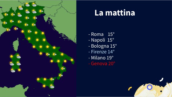 - Roma 26° - Napoli 25° - Bologna 26° - Firenze 29° - Milano 27° - Genova 27°
