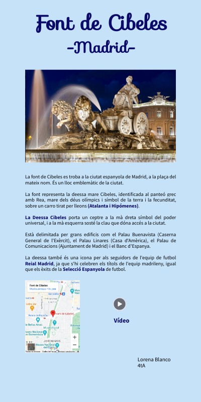La font de Cibeles es troba a la ciutat espanyola de Madrid, a la plaça del mateix nom. És un lloc emblemàtic de la ciutat. La font representa la deessa mare Cibeles, identificada al panteó grec amb Rea, mare dels déus olímpics i símbol de la terra i la fecunditat, sobre un carro tirat per lleons (Atalanta i Hipómenes). La Deessa Cibeles porta un ceptre a la mà dreta símbol del poder universal, i a la mà esquerra sosté la clau que dóna accés a la ciutat. Està delimitada per grans edificis com el Palau Buenavista (Caserna General de l'Exèrcit), el Palau Linares (Casa d'Amèrica), el Palau de Comunicacions (Ajuntament de Madrid) i el Banc d'Espanya. La deessa també és una icona per als seguidors de l'equip de futbol Reial Madrid, ja que s'hi celebren els títols de l'equip madrileny, igual que els èxits de la Selecció Espanyola de futbol.