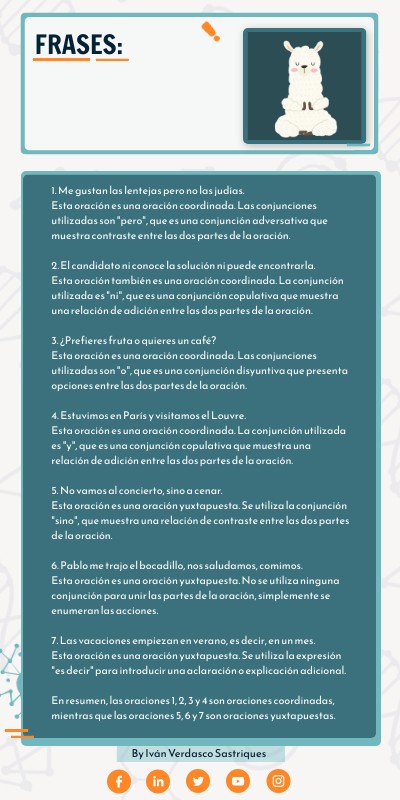 1. Me gustan las lentejas pero no las judías.Esta oración es una oración coordinada. Las conjunciones utilizadas son "pero", que es una conjunción adversativa que muestra contraste entre las dos partes de la oración.2. El candidato ni conoce la solución ni puede encontrarla.Esta oración también es una oración coordinada. La conjunción utilizada es "ni", que es una conjunción copulativa que muestra una relación de adición entre las dos partes de la oración.3. ¿Prefieres fruta o quieres un café?Esta oración es una oración coordinada. Las conjunciones utilizadas son "o", que es una conjunción disyuntiva que presenta opciones entre las dos partes de la oración.4. Estuvimos en París y visitamos el Louvre.Esta oración es una oración coordinada. La conjunción utilizada es "y", que es una conjunción copulativa que muestra una relación de adición entre las dos partes de la oración.5. No vamos al concierto, sino a cenar.Esta oración es una oración yuxtapuesta. Se utiliza la conjunción "sino", que muestra una relación de contraste entre las dos partes de la oración.6. Pablo me trajo el bocadillo, nos saludamos, comimos.Esta oración es una oración yuxtapuesta. No se utiliza ninguna conjunción para unir las partes de la oración, simplemente se enumeran las acciones.7. Las vacaciones empiezan en verano, es decir, en un mes.Esta oración es una oración yuxtapuesta. Se utiliza la expresión "es decir" para introducir una aclaración o explicación adicional.En resumen, las oraciones 1, 2, 3 y 4 son oraciones coordinadas, mientras que las oraciones 5, 6 y 7 son oraciones yuxtapuestas.