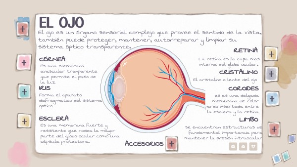 El ojo es un órgano sensorial complejo que provee el sentido de la vista, también puede proteger, mantener, autorreparar y limpiar su sistema óptico transparente.