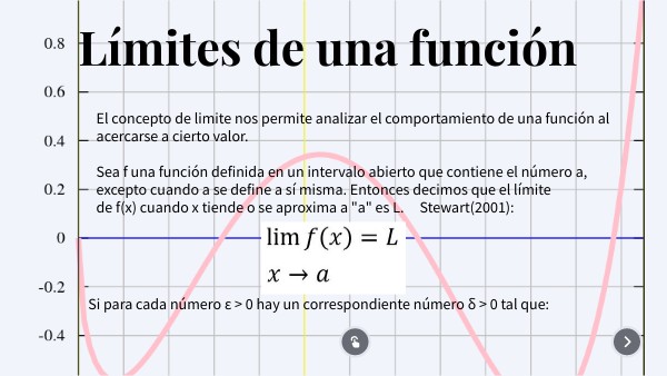 El concepto de limite nos permite analizar el comportamiento de una función al acercarse a cierto valor. Sea f una función definida en un intervalo abierto que contiene el número a, excepto cuando a se define a sí misma. Entonces decimos que el límite de f(x) cuando x tiende o se aproxima a "a" es L. Stewart(2001):