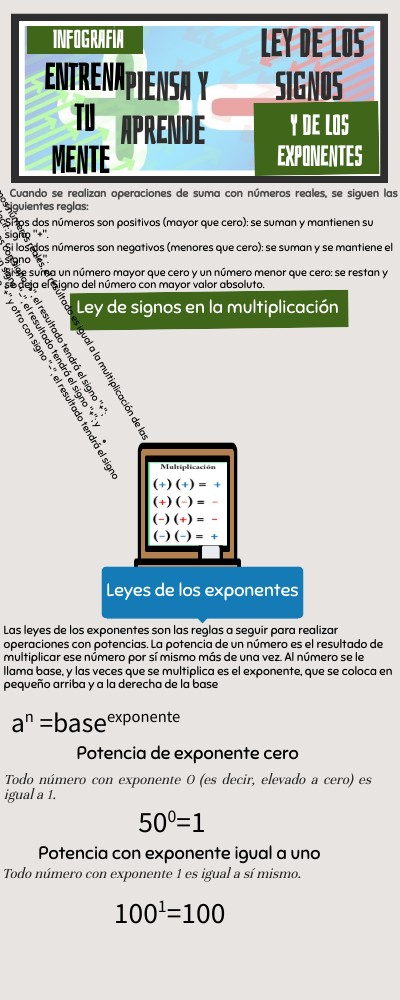 Las leyes de los exponentes son las reglas a seguir para realizar operaciones con potencias. La potencia de un número es el resultado de multiplicar ese número por sí mismo más de una vez. Al número se le llama base, y las veces que se multiplica es el exponente, que se coloca en pequeño arriba y a la derecha de la base