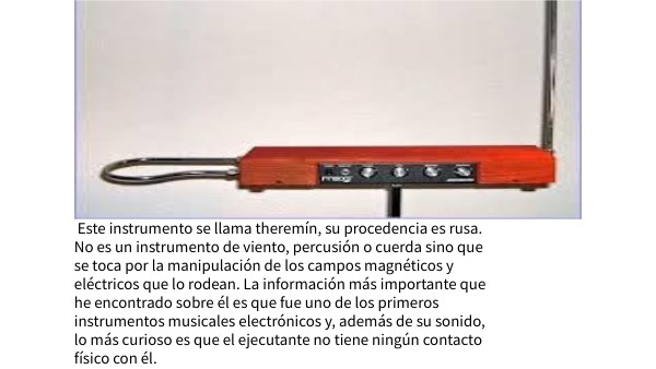 Este instrumento se llama theremín, su procedencia es rusa. No es un instrumento de viento, percusión o cuerda sino que se toca por la manipulación de los campos magnéticos y eléctricos que lo rodean. La información más importante que he encontrado sobre él es que fue uno de los primeros instrumentos musicales electrónicos y, además de su sonido, lo más curioso es que el ejecutante no tiene ningún contacto físico con él.