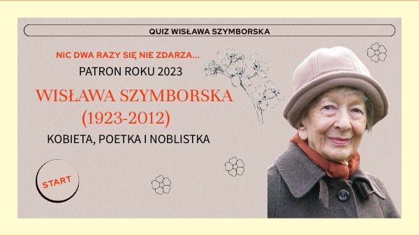 1. Slajd - tytułowy - zdjęcie portretowe: Wikipedia/ domena publiczna 2. Slajd - Zarys życiorysu - zdjęcie portretowe autorstwa Michała Rusinka z Fundacji Wisławy Szymborskiej w Krakowie za pisemną zgodą uzycia zdjęcia do quizu 3.- 18. Slajdu - rysunek graficzny autorstwa Stanisława Dąbrowskiego - MBP w Jaworznie 19., 20 i 22. Slajd - Pomyłka tło: rysunek uśmiecniętej Wisławy Szymborskiej w podeszył wieku autorstwa Katarzyny Stępień 20. Slajd - zdjęcie Wisławy Szymborskiej z 17 stycznia 2011 z Orderem Orła Białego autorstwa Chancellary of the President of Poland/ wikipedia/domena publiczna.