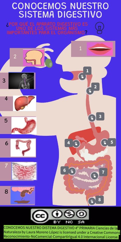 CONOCEMOS NUESTRO DISTEMA DIGESTIVO 4º PRIMARIA Ciencias de la Naturaleza by Laura Moreno López is licensed under a Creative Commons Reconocimiento-NoComercial-CompartirIgual 4.0 Internacional License.