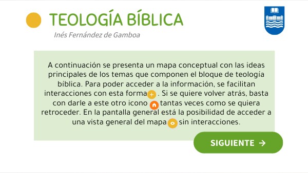 A continuación se presenta un mapa conceptual con las ideas principales de los temas que componen el bloque de teología bíblica. Para poder acceder a la información, se facilitan interacciones con esta forma . Si se quiere volver atrás, basta con darle a este otro icono tantas veces como se quiera retroceder. En la pantalla general está la posibilidad de acceder a una vista general del mapa sin interacciones.