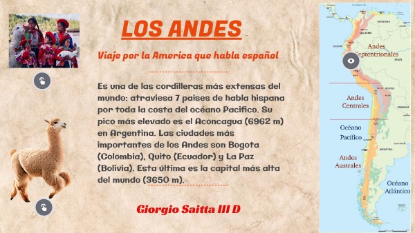 Es una de las cordilleras más extensas del mundo: atraviesa 7 paises de habla hispana por toda la costa del océano Pacifico. Su pico más elevado es el Aconcagua (6962 m) en Argentina. Las ciudades más importantes de los Andes son Bogota (Colombia), Quito (Ecuador) y La Paz (Bolivia). Esta última es la capital más alta del mundo (3650 m).