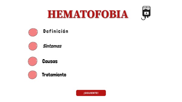 Miedo a la sangre y también a las heridas en sí. Las personas que tienen fobia a la sangre temen las heridas, cortes y las jeringuillas. Esta personas pueden llegar al desmayo y en casos extremos, a la pérdida del conocimiento.