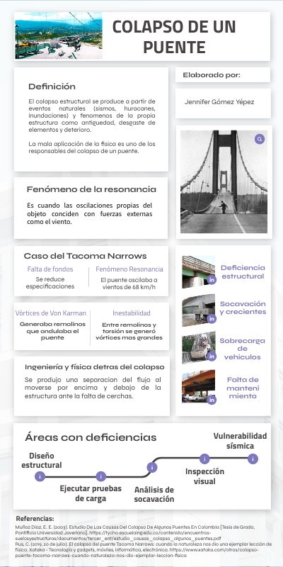 Muñoz Diaz, E. E. (2003). Estudio De Las Causas Del Colapso De Algunos Puentes En Colombia [Tesis de Grado, Pontificia Universidad Javeriana]. https://tycho.escuelaing.edu.co/contenido/encuentros-suelosyestructuras/documentos/tercer_ent/estudio_causas_colapso_algunos_puentes.pdf Rus, C. (2019, 20 de julio). El colapso del puente Tacoma Narrows: cuando la naturaleza nos dio una ejemplar lección de física. Xataka - Tecnología y gadgets, móviles, informática, electrónica. https://www.xataka.com/otros/colapso-puente-tacoma-narrows-cuando-naturaleza-nos-dio-ejemplar-leccion-fisica