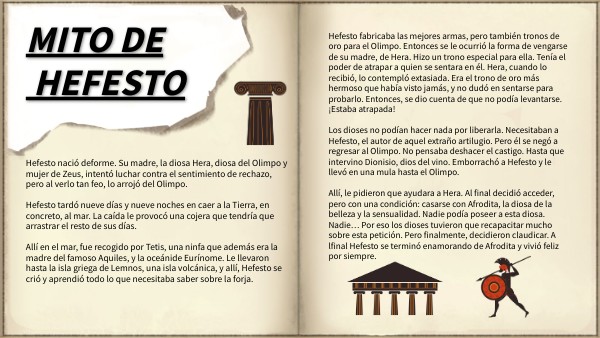 Hefesto fabricaba las mejores armas, pero también tronos de oro para el Olimpo. Entonces se le ocurrió la forma de vengarse de su madre, de Hera. Hizo un trono especial para ella. Tenía el poder de atrapar a quien se sentara en él. Hera, cuando lo recibió, lo contempló extasiada. Era el trono de oro más hermoso que había visto jamás, y no dudó en sentarse para probarlo. Entonces, se dio cuenta de que no podía levantarse. ¡Estaba atrapada! Los dioses no podían hacer nada por liberarla. Necesitaban a Hefesto, el autor de aquel extraño artilugio. Pero él se negó a regresar al Olimpo. No pensaba deshacer el castigo. Hasta que intervino Dionisio, dios del vino. Emborrachó a Hefesto y le llevó en una mula hasta el Olimpo. Allí, le pidieron que ayudara a Hera. Al final decidió acceder, pero con una condición: casarse con Afrodita, la diosa de la belleza y la sensualidad. Nadie podía poseer a esta diosa. Nadie… Por eso los dioses tuvieron que recapacitar mucho sobre esta petición. Pero finalmente, decidieron claudicar. A lfinal Hefesto se terminó enamorando de Afrodita y vivió feliz por siempre.