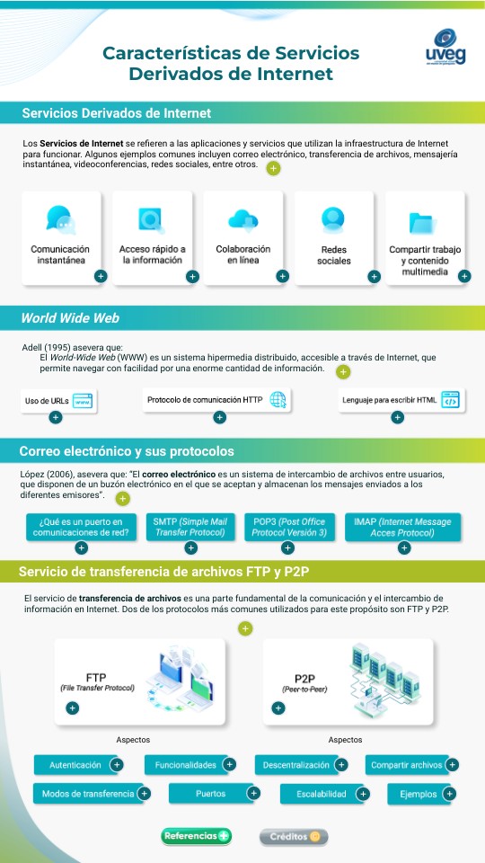 Los servicios de Internet se basan en protocolos y estándares que permiten la comunicación y el intercambio de información entre dispositivos conectados a Internet. Los servicios derivados de Internet han revolucionado nuestra forma de comunicarnos, colaborar y compartir información, rompiendo barreras geográficas y permitiéndonos estar conectados de manera global.