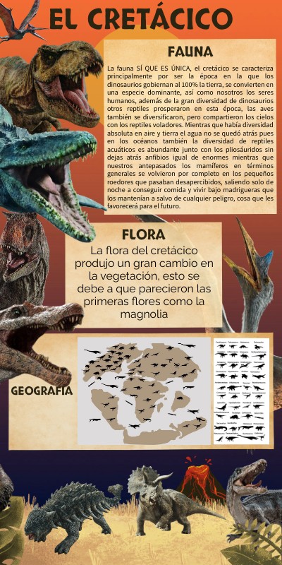 La fauna SÍ QUE ES ÚNICA, el cretácico se caracteriza principalmente por ser la época en la que los dinosaurios gobiernan al 100% la tierra, se convierten en una especie dominante, así como nosotros los seres humanos, además de la gran diversidad de dinosaurios otros reptiles prosperaron en esta época, las aves también se diversificaron, pero compartieron los cielos con los reptiles voladores. Mientras que había diversidad absoluta en aire y tierra el agua no se quedó atrás pues en los océanos también la diversidad de reptiles acuáticos es abundante junto con los pliosáuridos sin dejas atrás anfibios igual de enormes mientras que nuestros antepasados los mamíferos en términos generales se volvieron por completo en los pequeños roedores que pasaban desapercibidos, saliendo solo de noche a conseguir comida y vivir bajo madrigueras que los mantenían a salvo de cualquier peligro, cosa que les favorecerá para el futuro.
