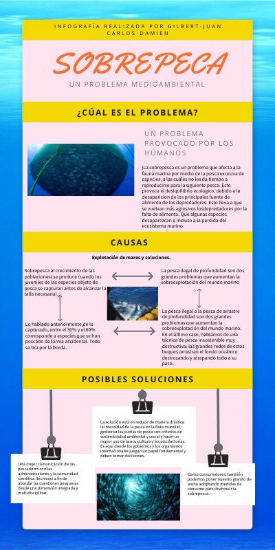 jLa sobrepesca es un problema que afecta a la fauna marina por medio de la pesca excesiva de especies, a las cuales no les da tiempo a reproducirse para la siguiente pesca. Esto provoca el desiquilibrio ecologico, debido a la desaparicion de los principales fuente de alimento de los depredadores. Esto lleva a que se vuelvan más agresivos losdepredadores por la falta de alimento. Que algunas especies desaparezcan o incluso a la perdida del ecosistema marino