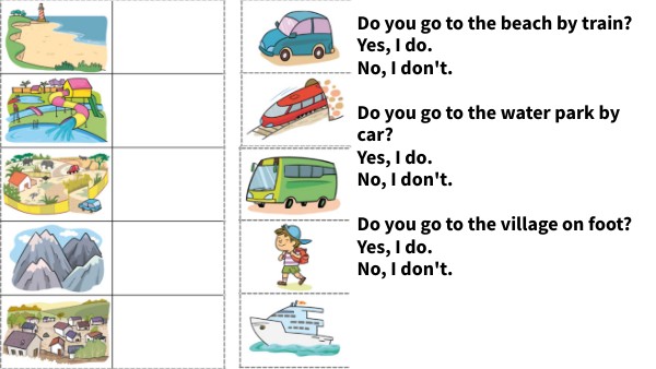 Do you go to the beach by train? Yes, I do. No, I don't. Do you go to the water park by car? Yes, I do. No, I don't. Do you go to the village on foot? Yes, I do. No, I don't.