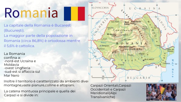 La capitale della Romania è Bucarest (București).La maggior parte della popolazione in Romania (circa 86,8%) è ortodossa mentre il 5,6% è cattolica.