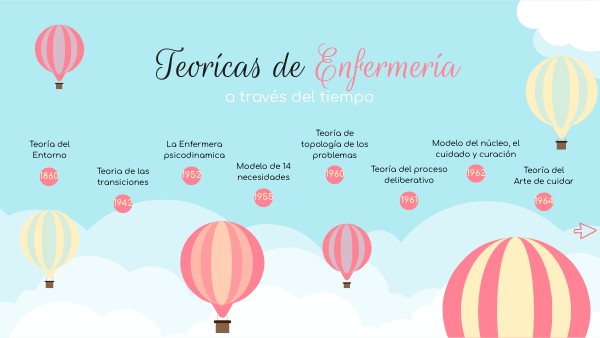 En la presente linea del tiempo se ve como cada teorica a lo largo del tiempo ha ido aportando conceptos para el cuidado correcto del paciente, empezando por Florence que fue la primera teorica.
