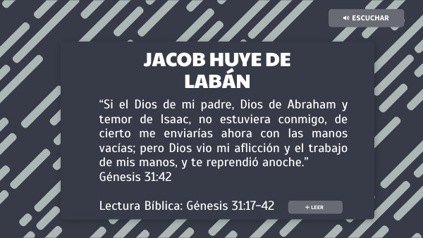 En la historia de hoy podemos ver a Jacob quien a pesar de haber visto la mano de Dios en su vida todo el tiempo, como Dios se lo había prometido y sabiendo que estaba haciendo lo que Dios le había dicho, tuvo miedo de la reacción de Labán y decido huir a escondidas de su suegro. Jacob tomó a sus esposas, a sus hijos, a su ganado y todo lo que había adquirido para irse a la tierra de su padre, sin embargo, engaño a Labán al no decirle que se iba. Vemos en Jacob a un hombre como nosotros con fallas y temores, que al parecer no le preguntó a Dios los pasos que debía seguir para cumplir con el propósito de Dios.