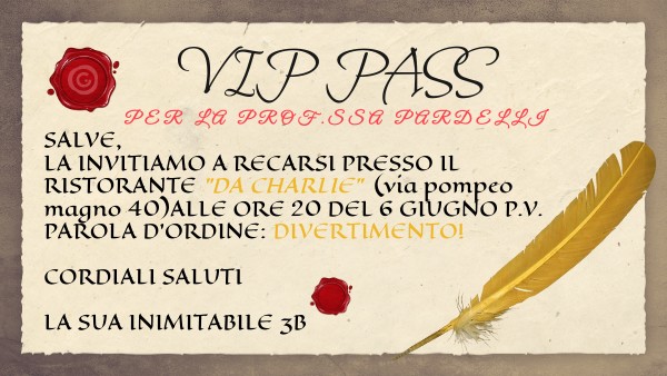 SALVE, LA INVITIAMO A RECARSI PRESSO IL RISTORANTE "DA CHARLIE" (via pompeo magno 40)ALLE ORE 20 DEL 6 GIUGNO P.V. PAROLA D'ORDINE: DIVERTIMENTO! CORDIALI SALUTI LA SUA INIMITABILE 3B