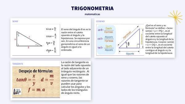 ¿Qué es el seno y su fórmula? se define: • Seno: sen(α) = y r = PQ r , es el cociente entre la longitud del cateto opuesto al ángulo α y la longitud de la hipotenusa. Coseno: sen(α) = x r = OQ r , es el cociente entre la longitud del cateto contiguo al ángulo α y la longitud de la hipotenusa.