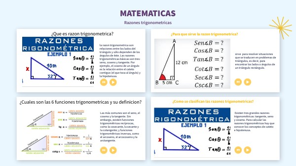 Existen tres grandes razones trigonométricas: tangente, seno y coseno. Para calcular las razones trigonométricas hay que conocer los conceptos de cateto e hipotenusa.