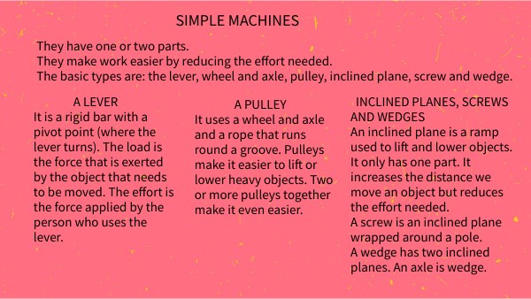 They have one or two parts. They make work easier by reducing the effort needed. The basic types are: the lever, wheel and axle, pulley, inclined plane, screw and wedge.
