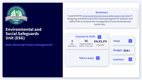 I supported the Environmental and Social Safeguards Unit (ESG) in designing and delivering online training programs for partners and staff of ESG to enhance the management of environmental and social risks.