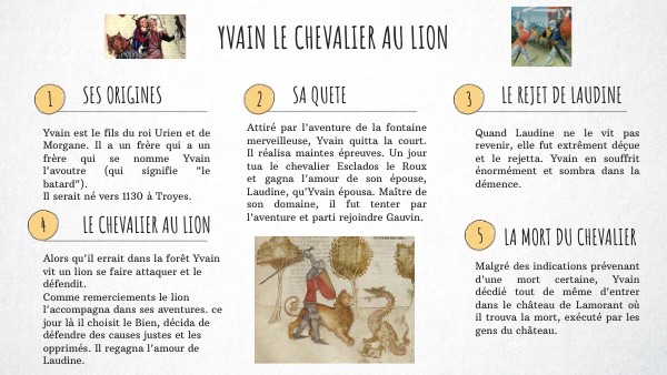Alors qu'il errait dans la forêt Yvain vit un lion se faire attaquer et le défendit. Comme remerciements le lion l'accompagna dans ses aventures. ce jour là il choisit le Bien, décida de défendre des causes justes et les opprimés. Il regagna l'amour de Laudine.