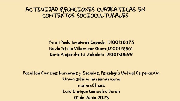 Yenni Paola Izquierdo Capador ID100130375 Neyla Stella Villamizar Quero,ID100128861 Dario Alejandro Gil Zabaleta ID100130699 Facultad Ciencias Humanas y Sociales, Psicología Virtual Corporación Universitaria Iberoamericana matemáticas Luis Enrique Gonzales Duran 01 de Junio 2023