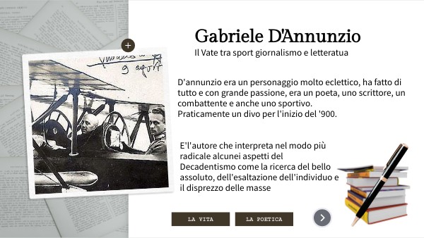 E'l'autore che interpreta nel modo più radicale alcunei aspetti del Decadentismo come la ricerca del bello assoluto, dell'esaltazione dell'individuo e il disprezzo delle masse
