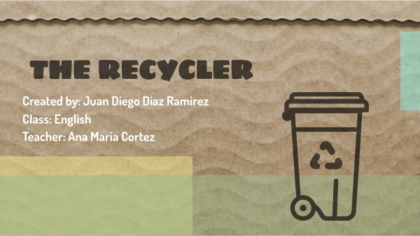 The recycler are desing for two important parts, the first one is the superior part, in this have the camera who recognize the type of garbage and the hole to throw them. At the second part are the division of sectors according to the kind of garbage, them has a caracteristic color according to the garbage. Ej BLUE. PAPER The recycler works like this: you put the garbage in the hole of the superior part, the camara scan this and after that recognize the type of garbage and finally and small robotic arm put the garbage in the sector according.