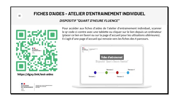 Pour accéder aux fiches d'aides de l'atelier d'entrainement individuel, scanner le qr code ci-contre avec une tablette ou cliquer sur le lien depuis un ordinateur (placer ce lien en favori ou sur la page d'accueil pour les utlisations ultérieures). Il s'agit d'une page d'accueil qui renvoie vers les fiches des 4 parcours.