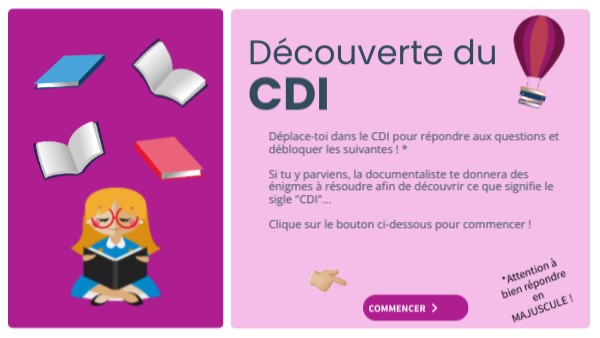 Déplace-toi dans le CDI pour répondre aux questions et débloquer les suivantes ! * Si tu y parviens, la documentaliste te donnera des énigmes à résoudre afin de découvrir ce que signifie le sigle "CDI"... Clique sur le bouton ci-dessous pour commencer !
