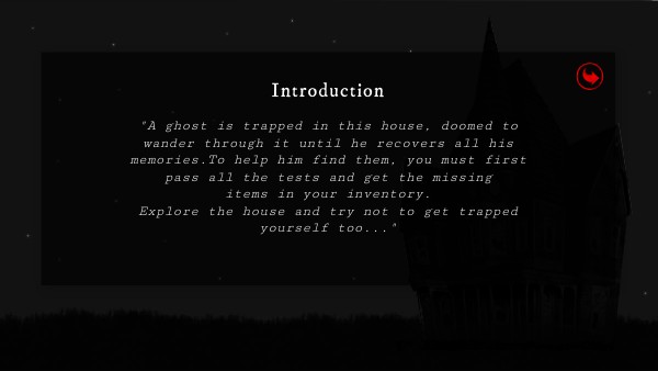 "A ghost is trapped in this house, doomed to wander through it until he recovers all his memories.To help him find them, you must first pass all the tests and get the missing items in your inventory. Explore the house and try not to get trapped yourself too..."