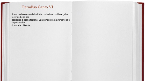 Siamo nel secondo cielo di Mercurio dove tra i beati, che fecero il bene per desiderio di gloria terrena, Dante incontra Giustiniano che risponde alle domande di Dante.