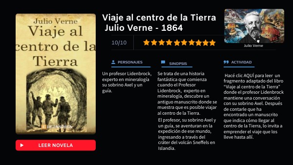 Hacé clic AQUÍ para leer un fragmento adaptado del libro “Viaje al centro de la Tierra” donde el profesor Lidenbrock mantiene una conversación con su sobrino Axel. Después de contarle que ha encontrado un manuscrito que indica cómo llegar al centro de la Tierra, lo invita a emprender el viaje que los lleve hasta allí.