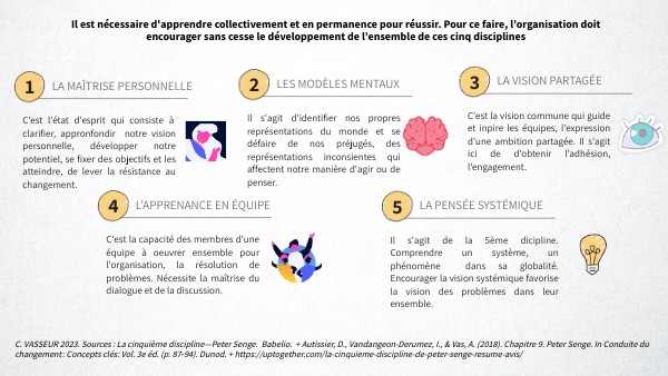 Il est nécessaire d'apprendre collectivement et en permanence pour réussir. Pour ce faire, l’organisation doit encourager sans cesse le développement de l’ensemble de ces cinq disciplines