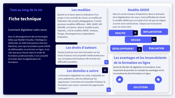 Dans le cas de manque d’expérience dans le domaine de la digitalisation du cours, il est préférable de choisir le modèle ADDIE pour sa clarté et le f ait que les étapes à suivre sont consécutives. Cliquez sur les boutons pour en savoir plus