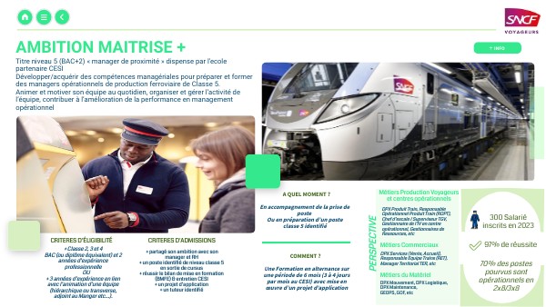 Titre niveau 5 (BAC+2) « manager de proximité » dispense par l'ecole partenaire CESI Développer/acquérir des compétences managériales pour préparer et former des managers opérationnels de production ferroviaire de Classe 5. Animer et motiver son équipe au quotidien, organiser et gérer l’activité de l’équipe, contribuer à l’amélioration de la performance en management opérationnel
