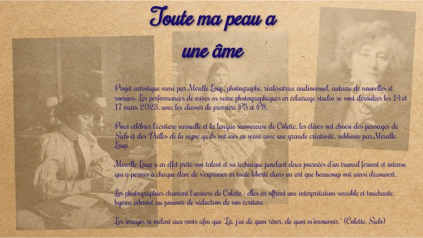 Projet artistique mené par Mirelle Loup, photographe, réalisatrice audiovisuel, auteure de nouvelles et romans. Les performances de mises en scène photographiques en éclairage studio se sont déroulées les 14 et 17 mars 2023, avec les classes de première P5 et P8. Pour célébrer l'écriture sensuelle et la langue savoureuse de Colette, les élèves ont choisi des passages de Sido et des Vrilles de la vigne qu'ils ont mis en scène avec une grande créativité, sublimée par Mireille Loup. Mireille Loup a en effet prêté son talent et sa technique pendant deux journées d'un travail fervent et intense qui a permis à chaque élève de s'exprimer en toute liberté dans un art que beaucoup ont ainsi découvert. Les photographies chantent l'univers de Colette : elles en offrent une interprétation sensible et touchante, hymne vibrant au pouvoir de séduction de son écriture. Les images se mêlent aux mots afin que "Là, j'ai de quoi rêver, de quoi m'émouvoir." (Colette, Sido)